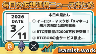 【仮想通貨ニュース 3/11】Xマネーが来月限定公開へ・BTC2000万枚突破・BTCBOXが2カ月超停止