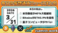 2026年3月31日の仮想通貨ニュースまとめ。米労働省が401k退職プランへの仮想通貨投資を大幅緩和する新ルールを提案、BitmineがETH全供給量の3.9%を保有・314万ETHをステーキング、量子コンピュータがBTC秘密鍵を9分で解読できる可能性をGoogleが研究発表。ミーがわかりやすく解説。