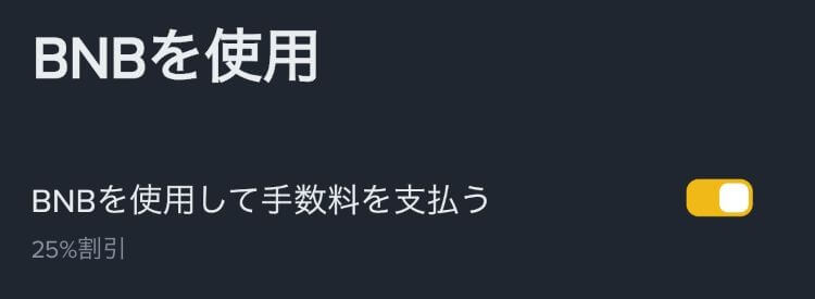 できます。Binance Japan取引画面の「BNB割引」をONにするだけで、現物取引手数料が通常0.1%から0.075%(25%割引)になります。